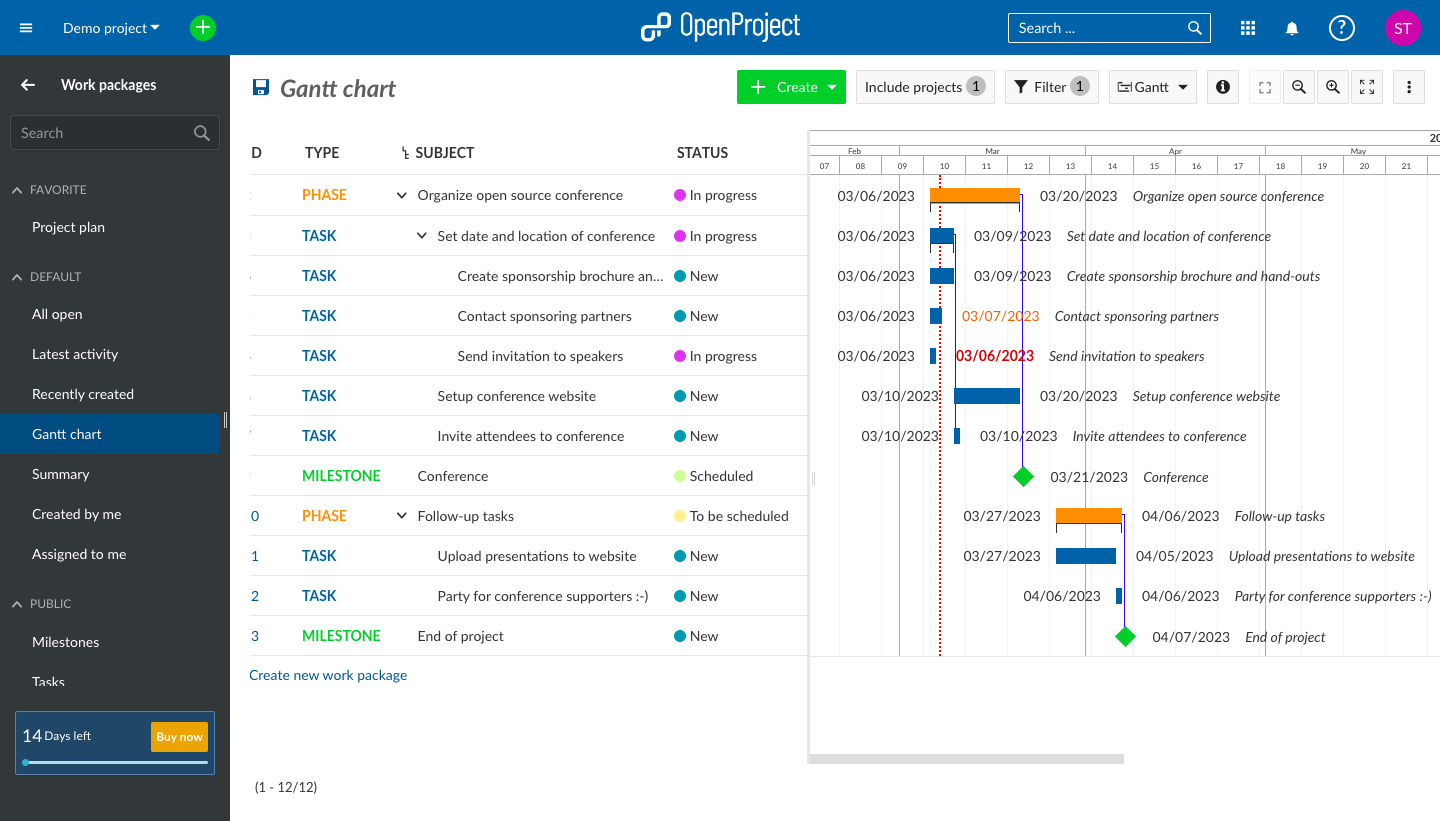 OpenProject is an open-source project management software that is particularly popular with data-sensitive organizations like public institutions, universities or health organizations. One of its standout features are its extensive project planning and tracking tools. OpenProject allows users to create detailed project plans, including tasks, milestones, and deadlines, and track progress towards those goals in real-time.